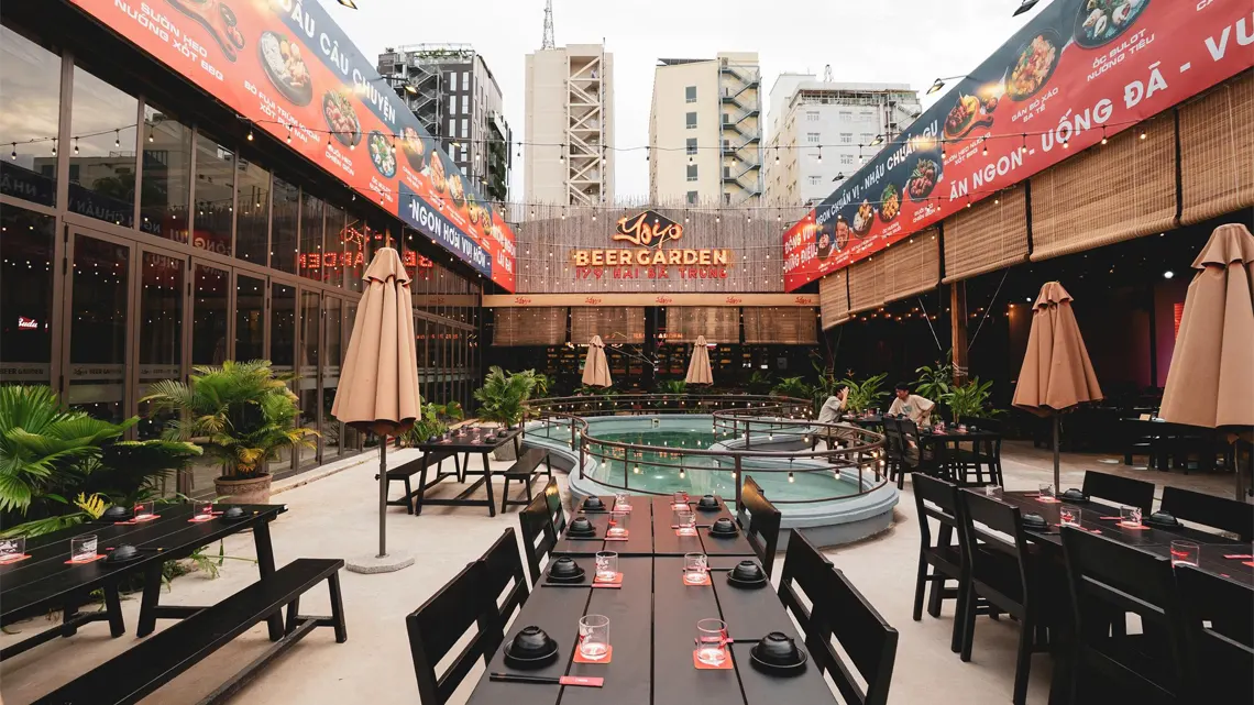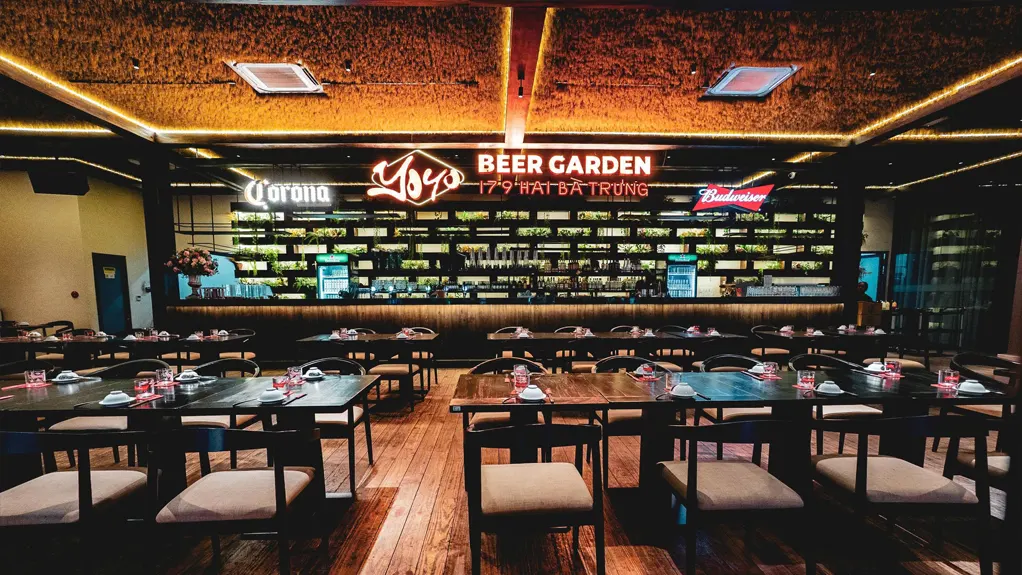 Yoyo Beer Garden – 179 Hai Bà Trưng, Quận 3. Không gian sân vườn sôi động, bia tươi mát lạnh, ẩm thực đa dạng. Đặt bàn ngay nhận ưu đãi!