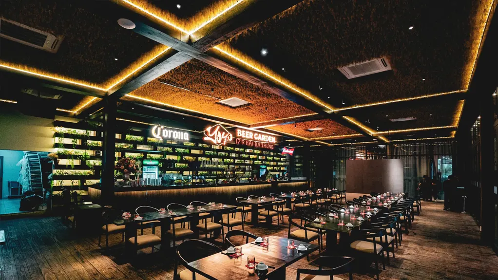 Trần cao thoáng đãng kết hợp cùng hệ thống cửa mở lớn mang lại cảm giác tự do, kết nối liền mạch giữa không gian trong và ngoài trời. Sự kết hợp của ánh sáng ấm áp, cây xanh và khu vực sân vườn rộng rãi giúp Yoyo Beer Garden trở thành địa điểm lý tưởng để vừa thưởng thức bia lạnh, vừa tận hưởng không khí sôi động nhưng thoải mái ngay giữa lòng thành phố.