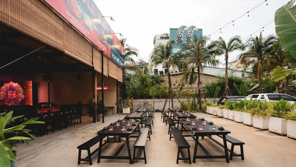 Không chỉ được yêu thích bởi thực đơn phong phú với nhiều món nhậu, hải sản và BBQ hấp dẫn, Yoyo Beer Garden – 179 Hai Bà Trưng, Quận 3 còn chinh phục thực khách nhờ không gian Beer Garden độc đáo. Sự kết hợp hài hòa giữa phong cách hiện đại, trẻ trung và không khí ngoài trời thoáng đãng mang đến trải nghiệm vừa sôi động vừa thư giãn.