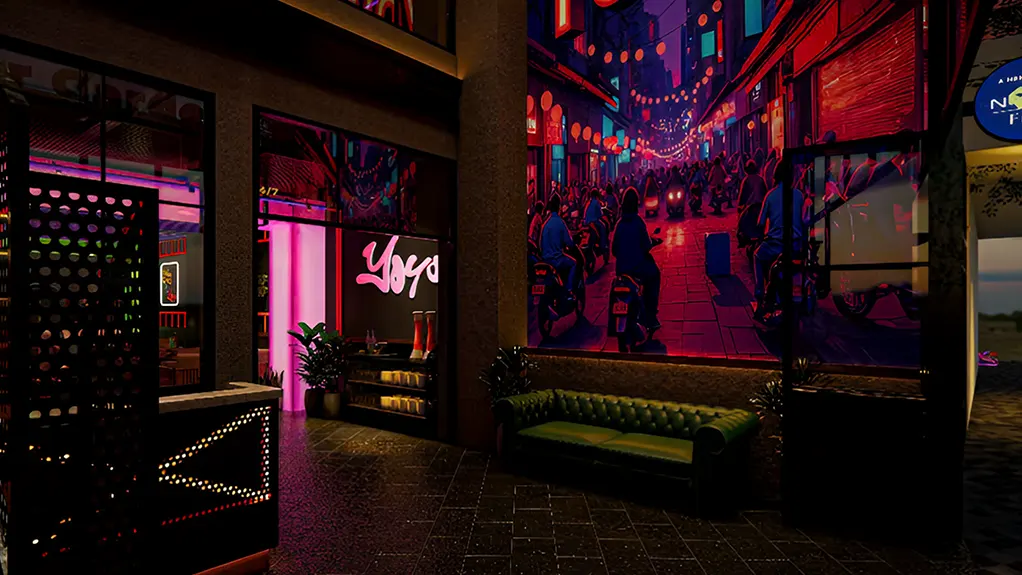 Trần cao thoáng đãng kết hợp cùng hệ thống cửa mở lớn mang lại cảm giác tự do, kết nối liền mạch giữa không gian trong và ngoài trời. Sự kết hợp của ánh sáng ấm áp, cây xanh và khu vực sân vườn rộng rãi giúp Yoyo Beer Garden trở thành địa điểm lý tưởng để vừa thưởng thức bia lạnh, vừa tận hưởng không khí sôi động nhưng thoải mái ngay giữa lòng thành phố.